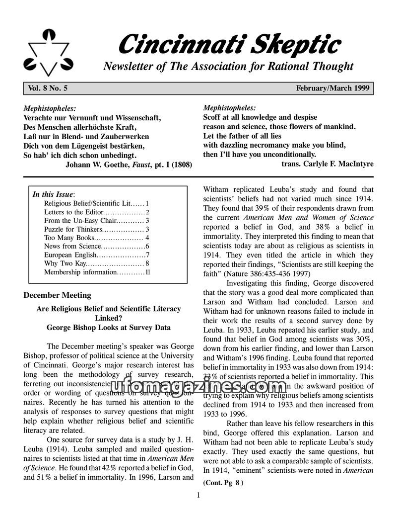 This issue of Cincinnati Skeptic delves into the relationship between religious belief and scientific literacy, presenting research that suggests a correlation between higher educa