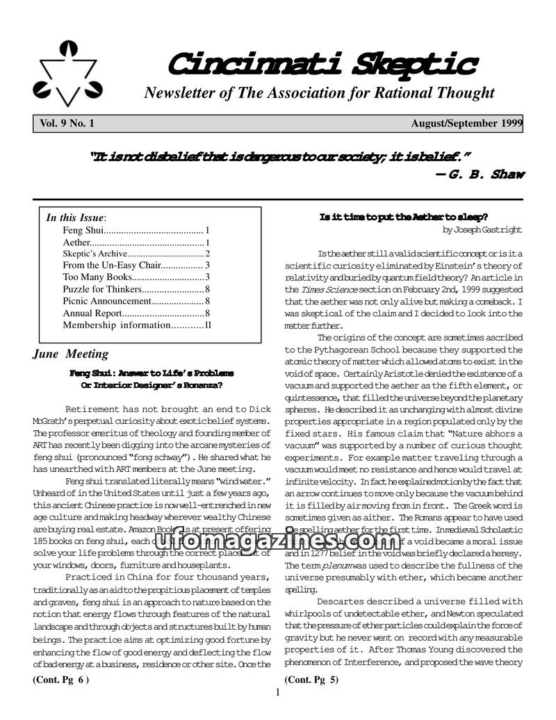 This issue of the Cincinnati Skeptic covers topics such as Feng Shui, its origins and modern applications, and the scientific concept of the Aether, questioning its validity in lig