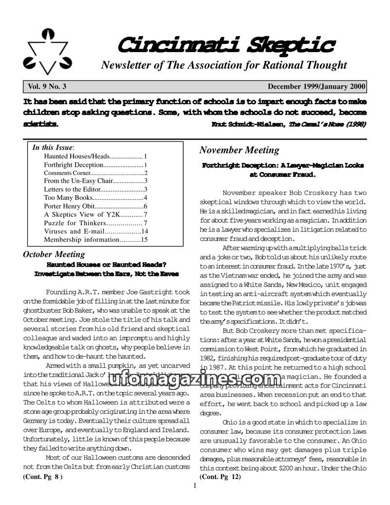 This issue of the Cincinnati Skeptic features articles on consumer fraud by a lawyer-magician, an investigation into Halloween traditions and beliefs in ghosts, a review of Alex He
