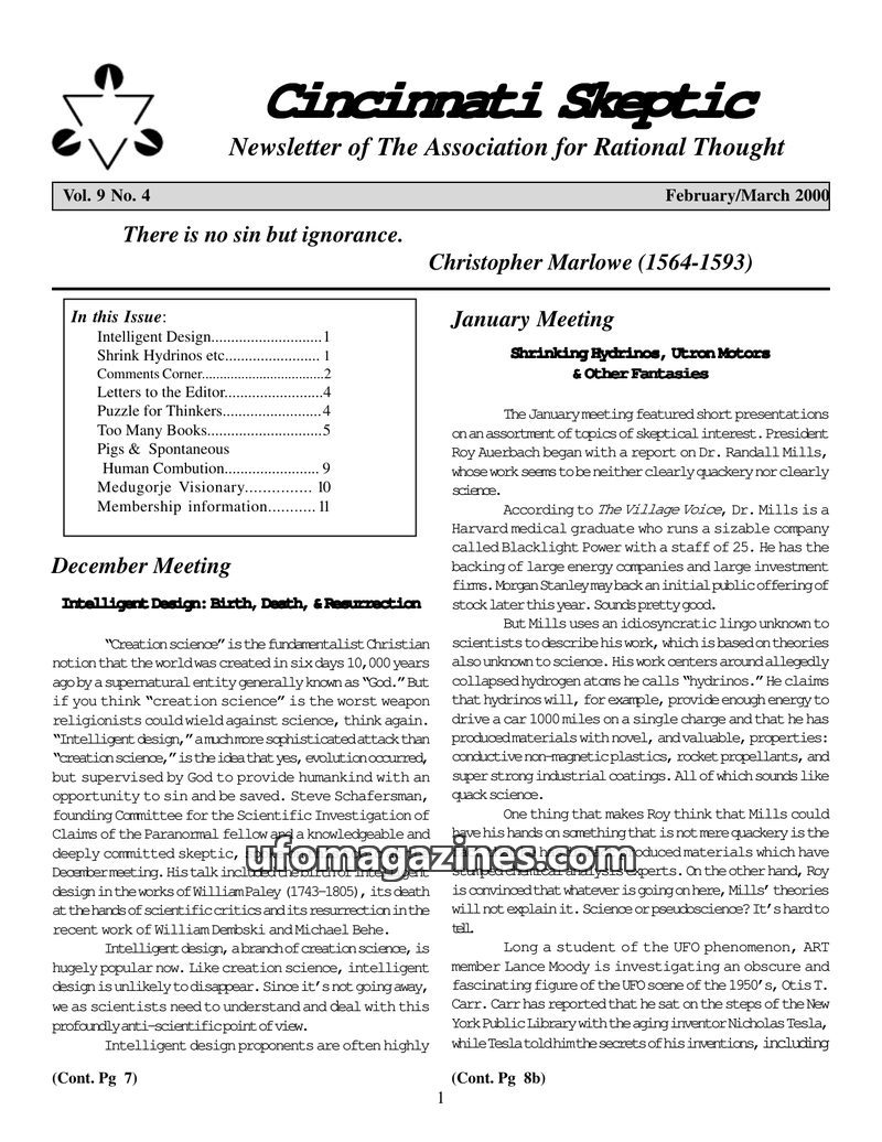This issue of Cincinnati Skeptic covers a range of topics including the "Intelligent Design" movement, Dr. Randall Mills' controversial 'hydrino' theory, the history of UFO promote