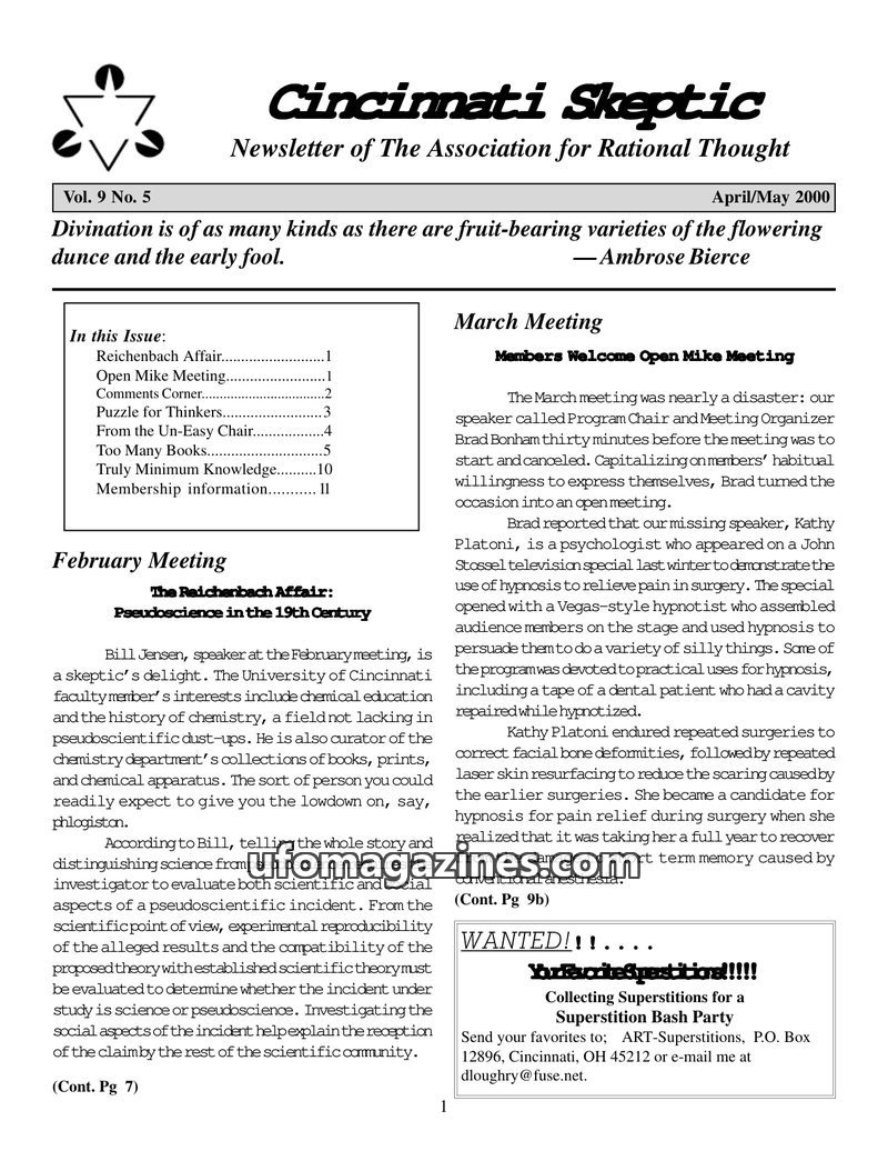 This issue of the Cincinnati Skeptic delves into various pseudoscientific topics and historical cases. It features a discussion on the Reichenbach Affair and the concept of the 'Od