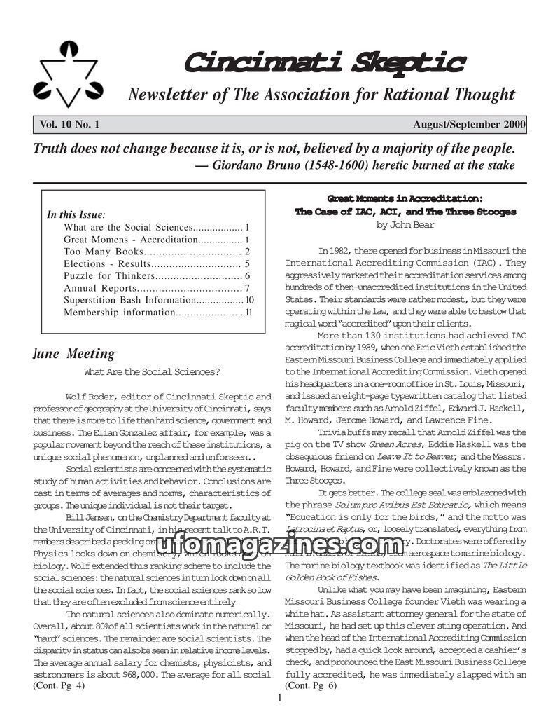 This issue of Cincinnati Skeptic covers the nature and status of social sciences, contrasting them with natural sciences. It details the fraudulent practices of accreditation mills