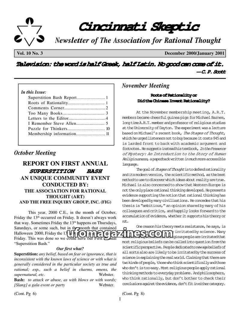 This issue of the Cincinnati Skeptic covers the first annual 'Superstition Bash' organized by ART and FIG, an event aimed at debunking superstitions. It also features a discussion