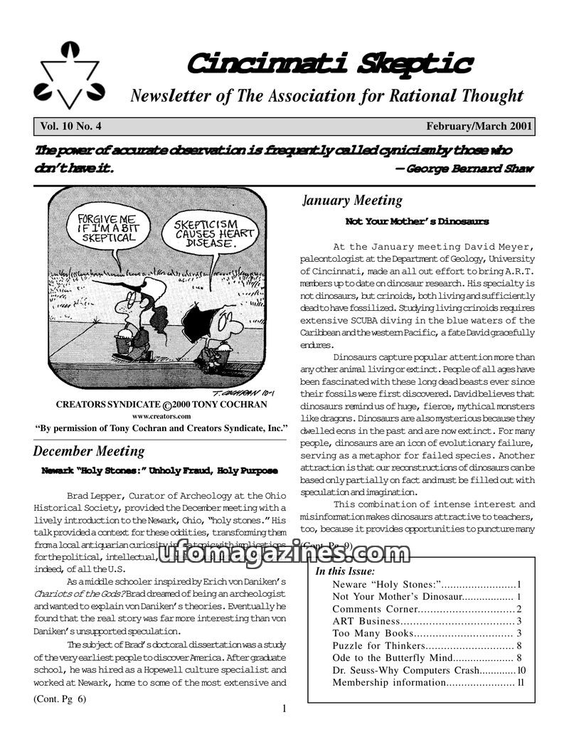 This issue of Cincinnati Skeptic delves into various topics from a rational perspective. It examines the Newark 'Holy Stones' incident, concluding they were a fraud likely perpetra