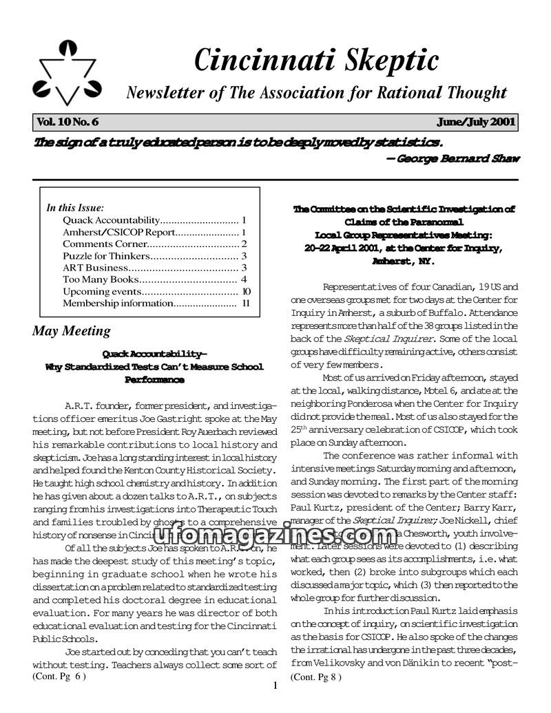 This issue of the Cincinnati Skeptic features an article on the limitations of standardized testing in measuring school performance, a report from a CSICOP local group representati