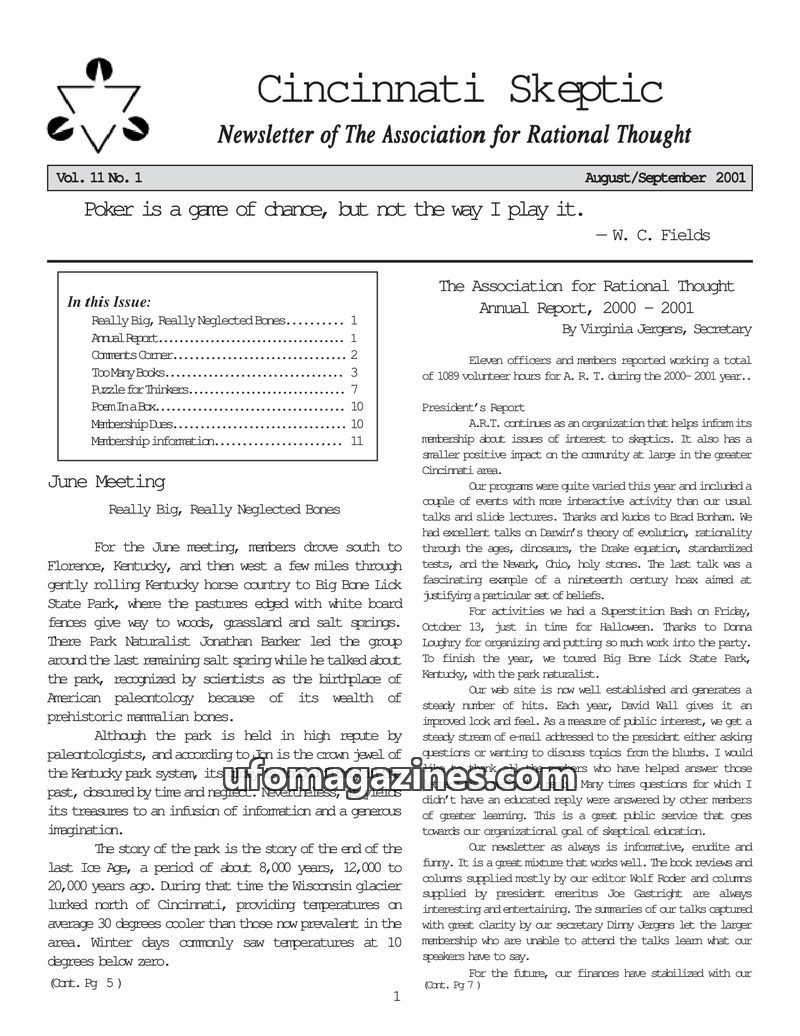 This issue of the Cincinnati Skeptic newsletter covers the June meeting at Big Bone Lick State Park, highlighting its paleontological significance and historical neglect. It includ