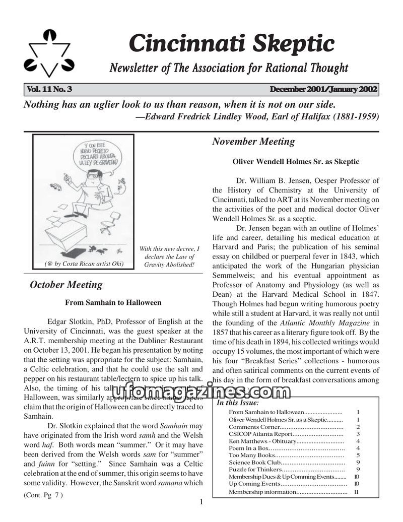 This issue of the Cincinnati Skeptic newsletter covers various topics including the historical origins of Halloween, the skeptical views of Oliver Wendell Holmes Sr., the mysteriou