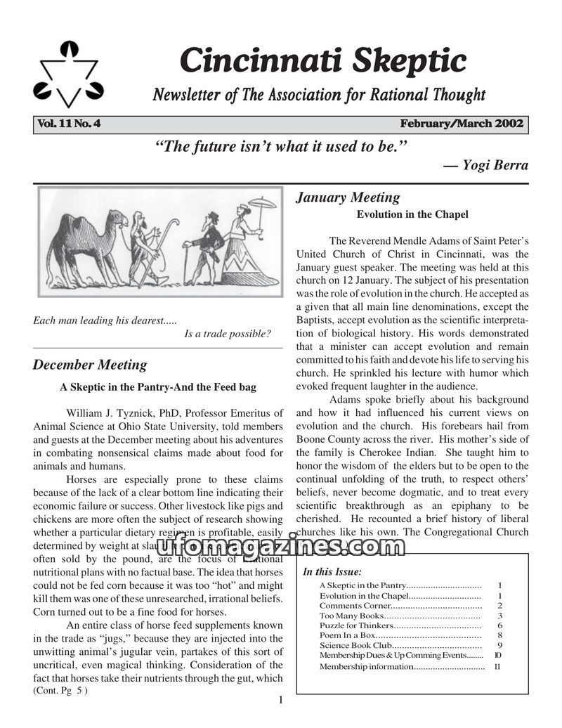 This issue of Cincinnati Skeptic covers a range of topics including the Reverend Mendle Adams' discussion on evolution within the church, William J. Tyznick's critique of nonsensic