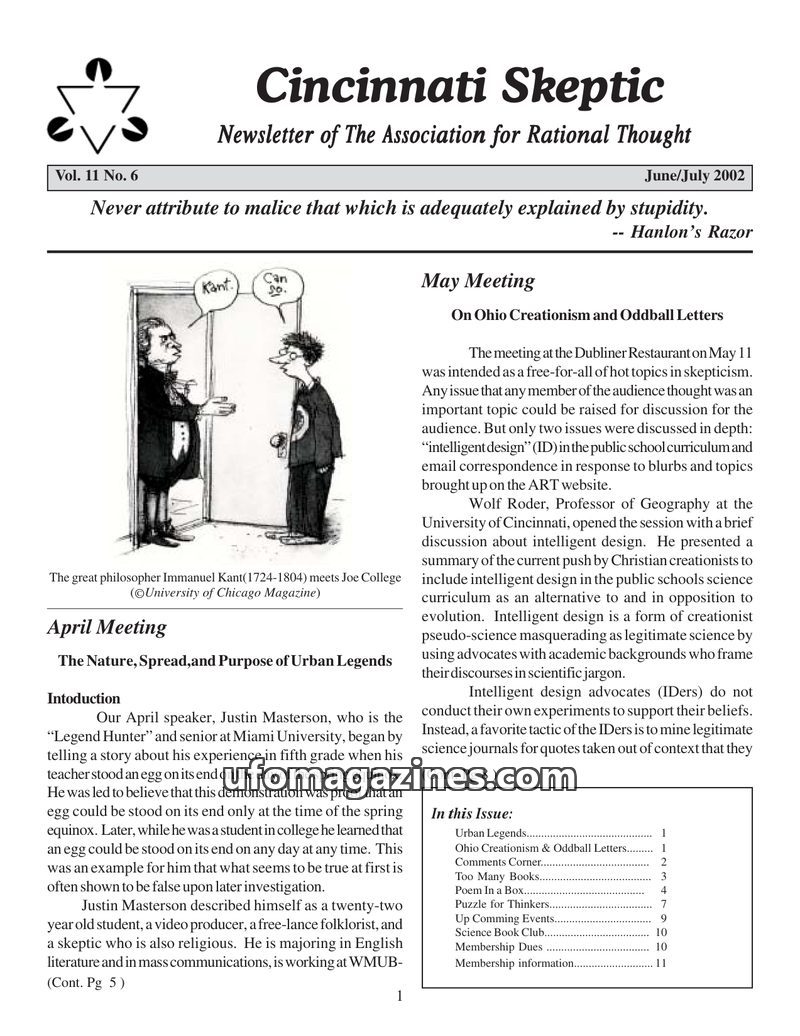 The June/July 2002 issue of Cincinnati Skeptic features discussions on urban legends, including their study and spread, and the debate surrounding 'intelligent design' in Ohio's sc