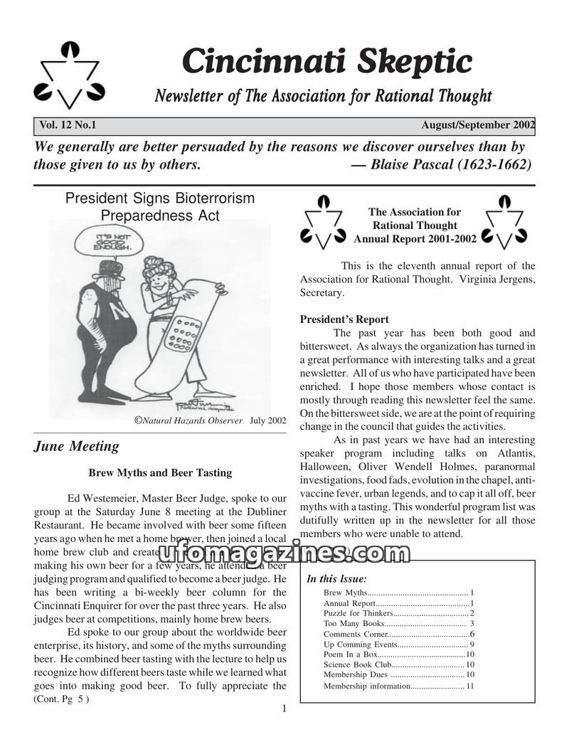 This issue of the Cincinnati Skeptic covers a variety of topics including a report on the Association for Rational Thought's annual activities, a discussion of beer myths and tasti