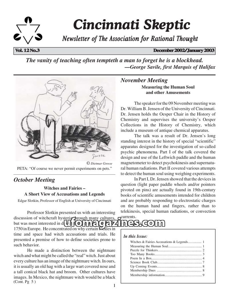 This issue of Cincinnati Skeptic covers witchcraft accusations in Europe, scientific attempts to measure the human soul, and reviews of astronomy books. It also explores sociologic