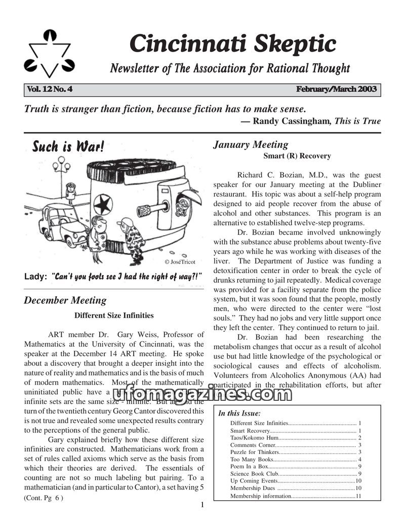 This issue of the Cincinnati Skeptic features discussions on mathematical concepts like different sizes of infinity, as explained by Dr. Gary Weiss. It also delves into addiction r