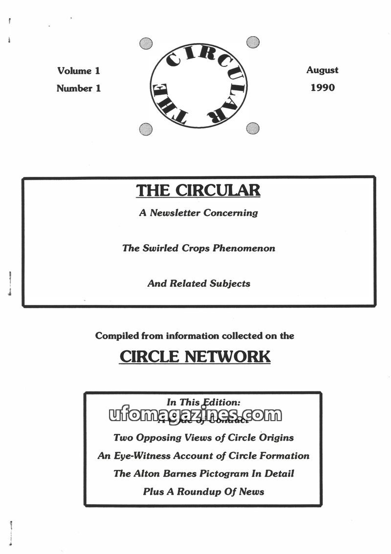 This inaugural issue of 'The Circular' newsletter, dated August 1990, focuses on the crop circle phenomenon. It aims to provide a platform for open-minded investigation and sharing