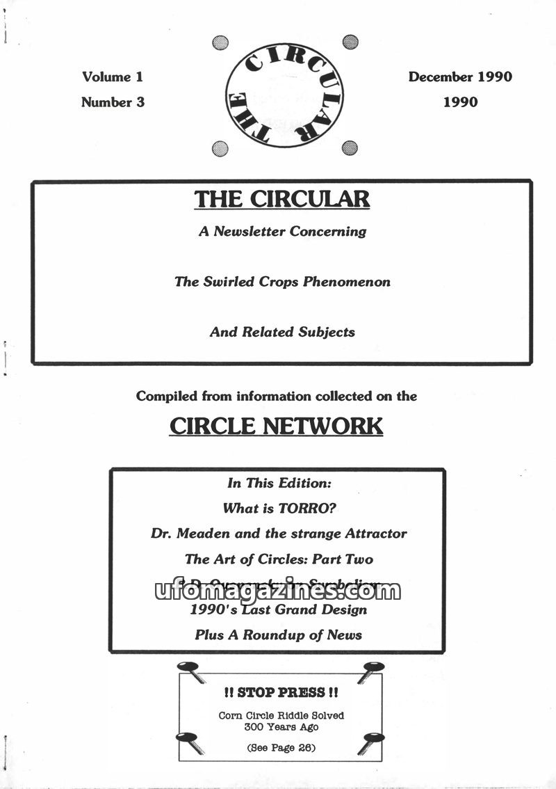 This December 1990 issue of 'The Circular' newsletter focuses on the swirled crops phenomenon and related subjects, compiled by the Circle Network. It includes an introduction by B