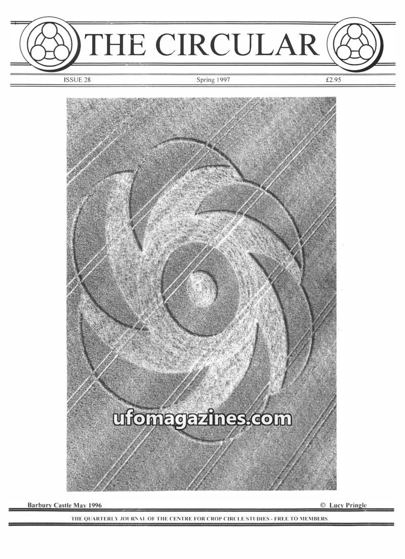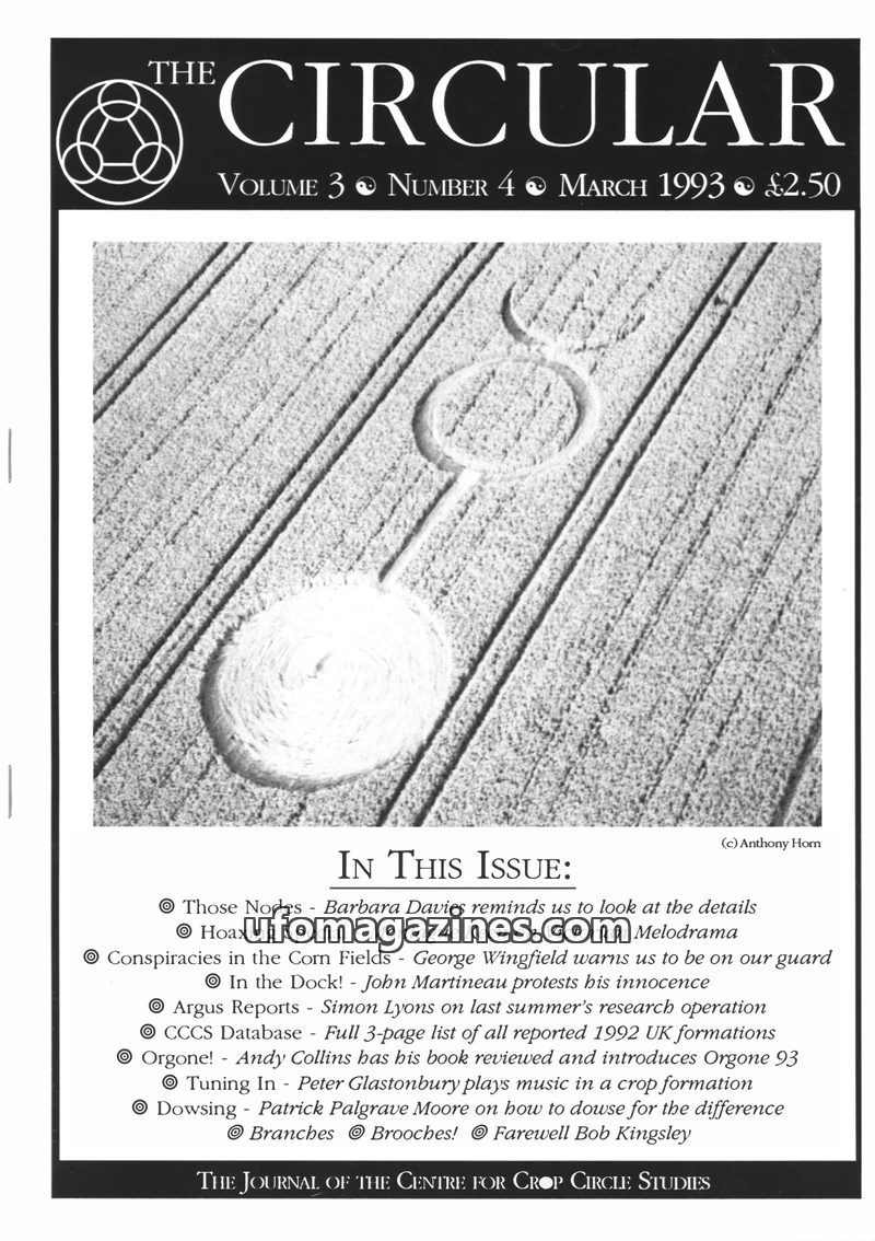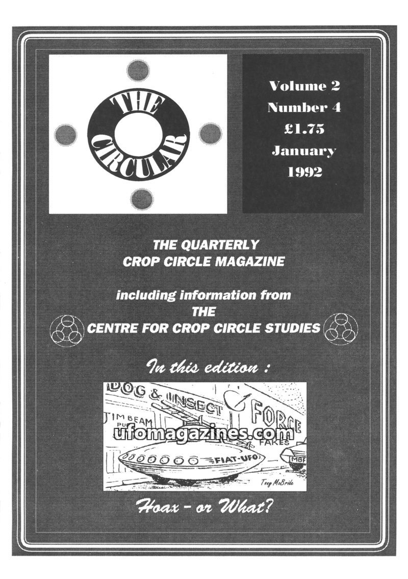 This issue of The Circular, the last edited by Bob Kingsley, focuses on the potential for hoaxing in crop circle formations, with a detailed examination of evidence at Cheesefoot H