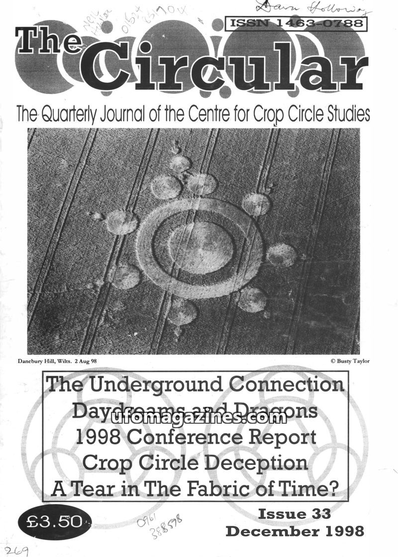 This issue of The Circular covers the 1998 crop circle season, including a report on the CCCS conference in Birmingham. Articles discuss the 'Underground Connection', 'Daydreams an