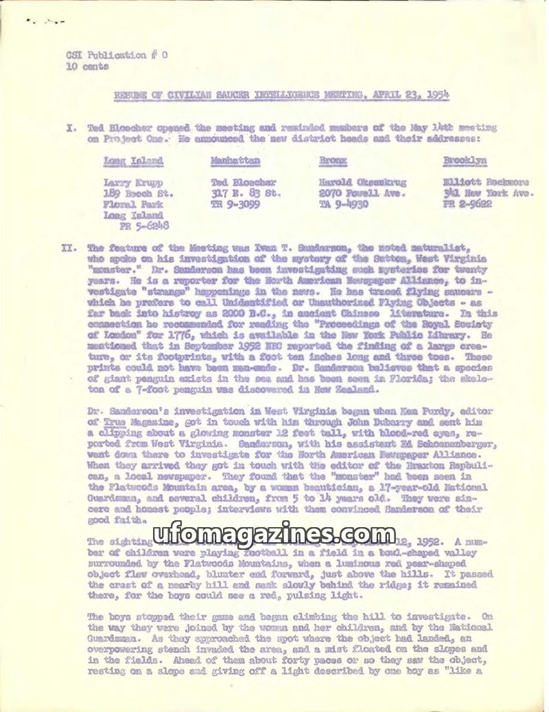 The Civilian Saucer Intelligence meeting on April 23, 1954, included a presentation by naturalist Ivan T. Sanderson regarding his investigation of the 'Sutton, West Virginia monste