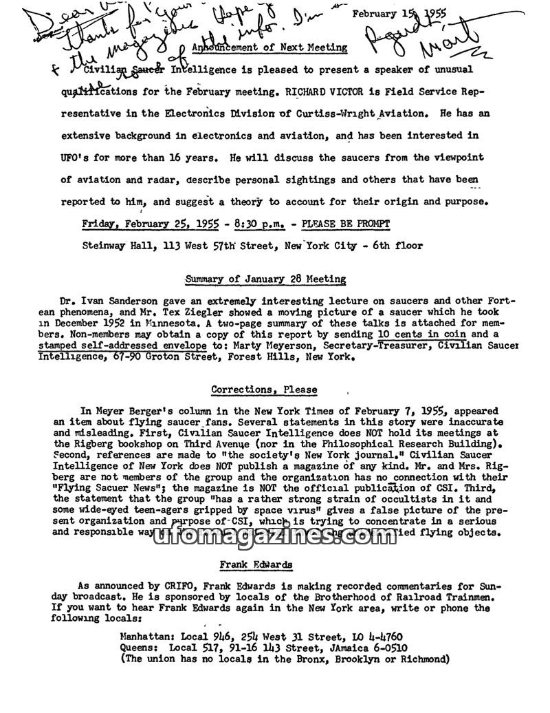 This issue of Civilian Saucer Intelligence (CSI) covers early 1955 meetings and announcements. A February meeting featured Richard Victor discussing UFOs from an electronics and av