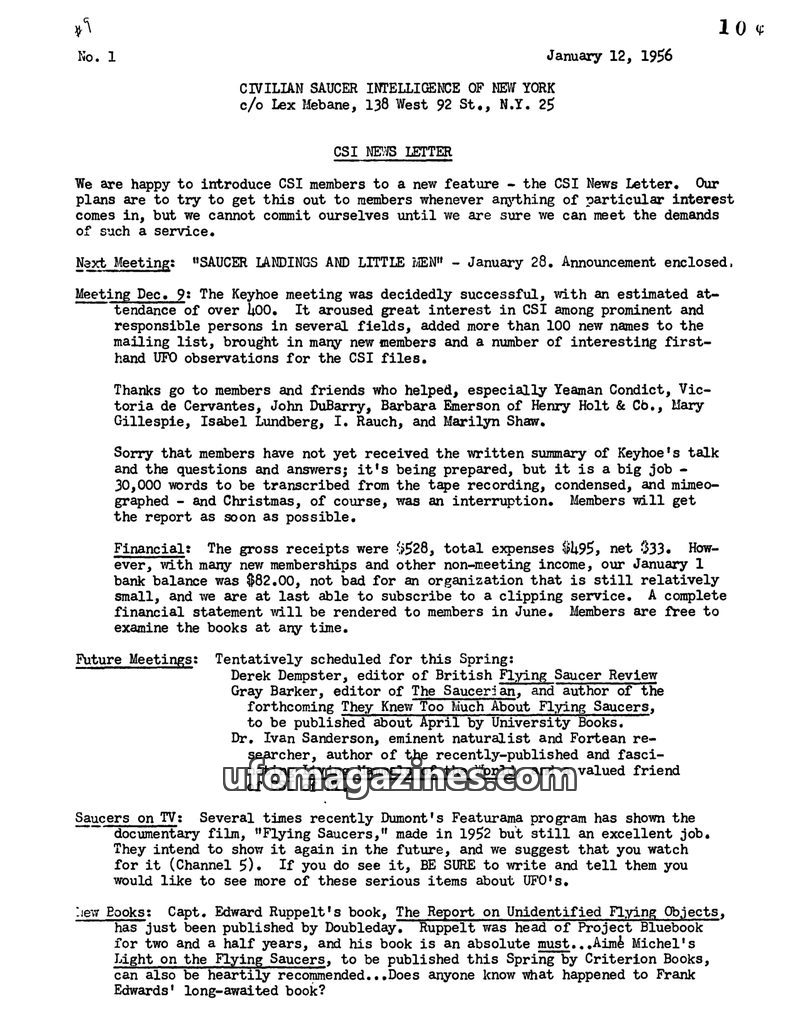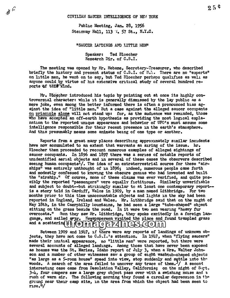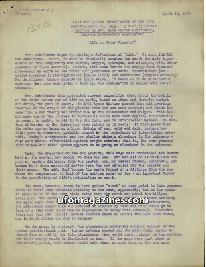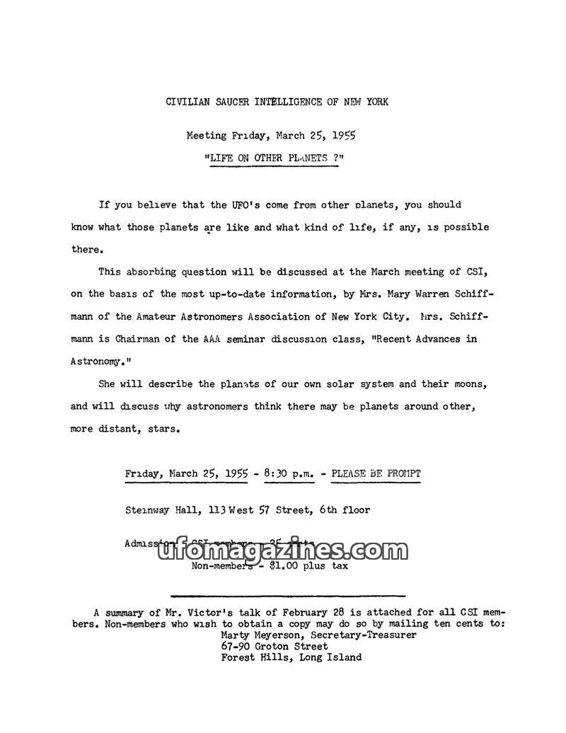 The Civilian Saucer Intelligence of New York (CSI) held a meeting on March 25, 1955, featuring Mrs. Mary Warren Schiffmann discussing the possibility of life on other planets and r
