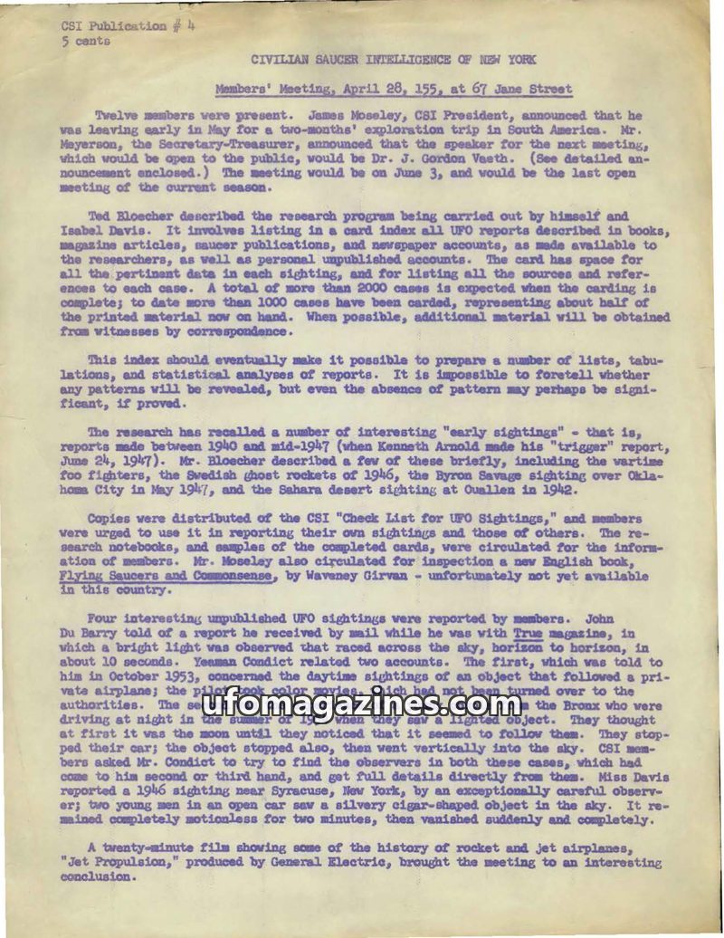 The April 28, 1955 meeting of the Civilian Saucer Intelligence of New York (CSI) featured updates on a comprehensive research program by Ted Bloecher and Isabel Davis, aiming to ca