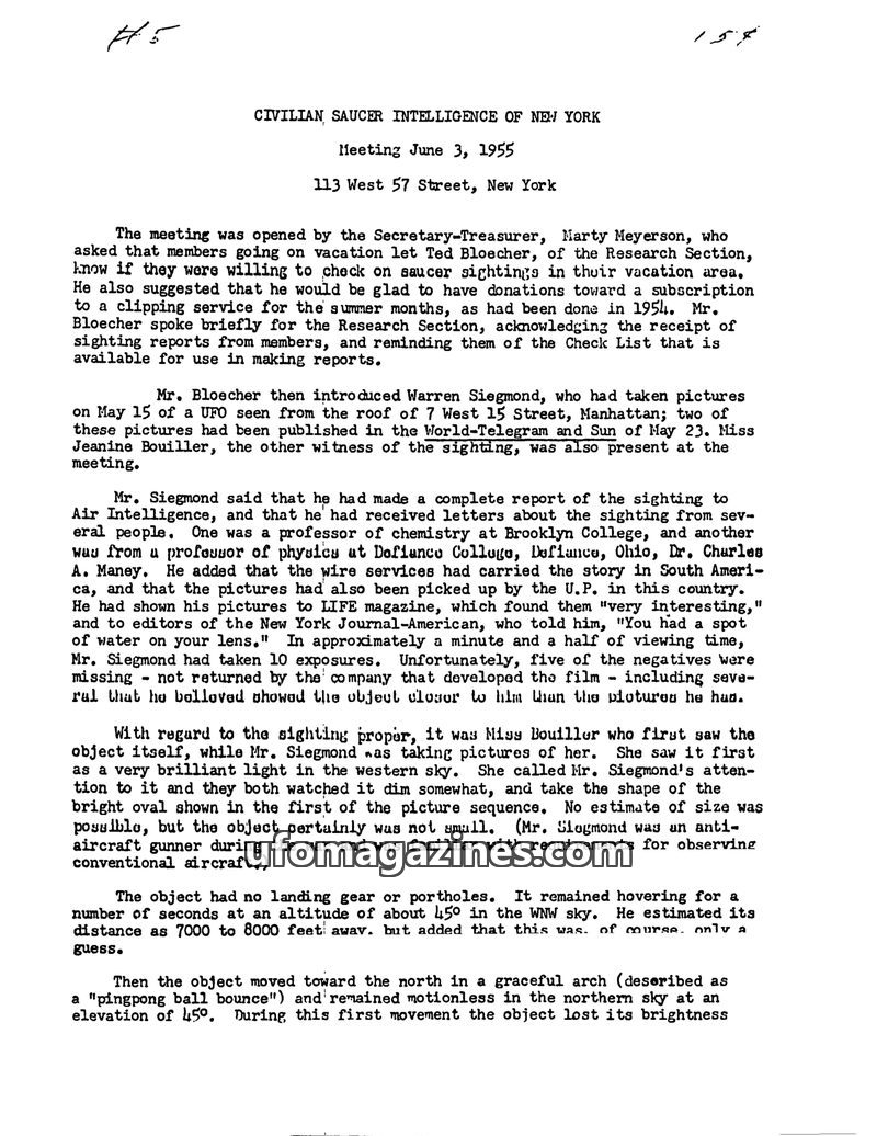 The meeting of the Civilian Saucer Intelligence of New York on June 3, 1955, featured a presentation by Warren Siegmond of his May 15th UFO sighting in Manhattan, including photogr