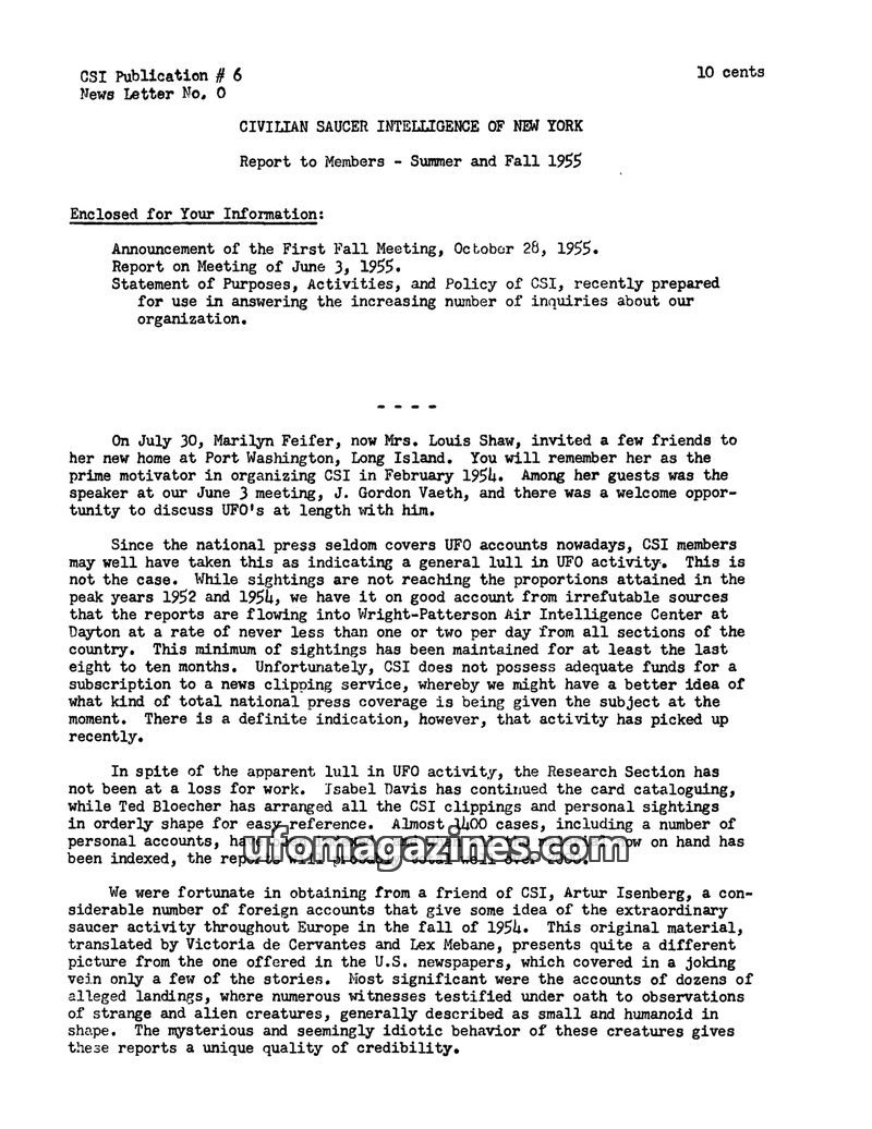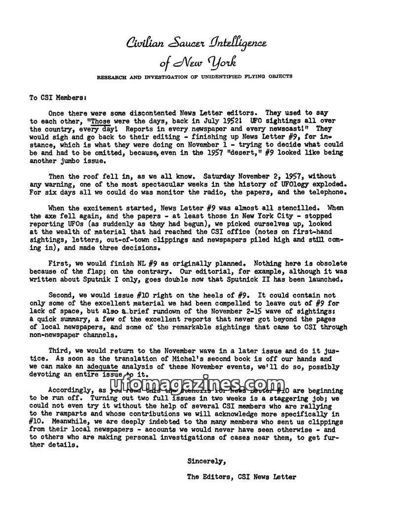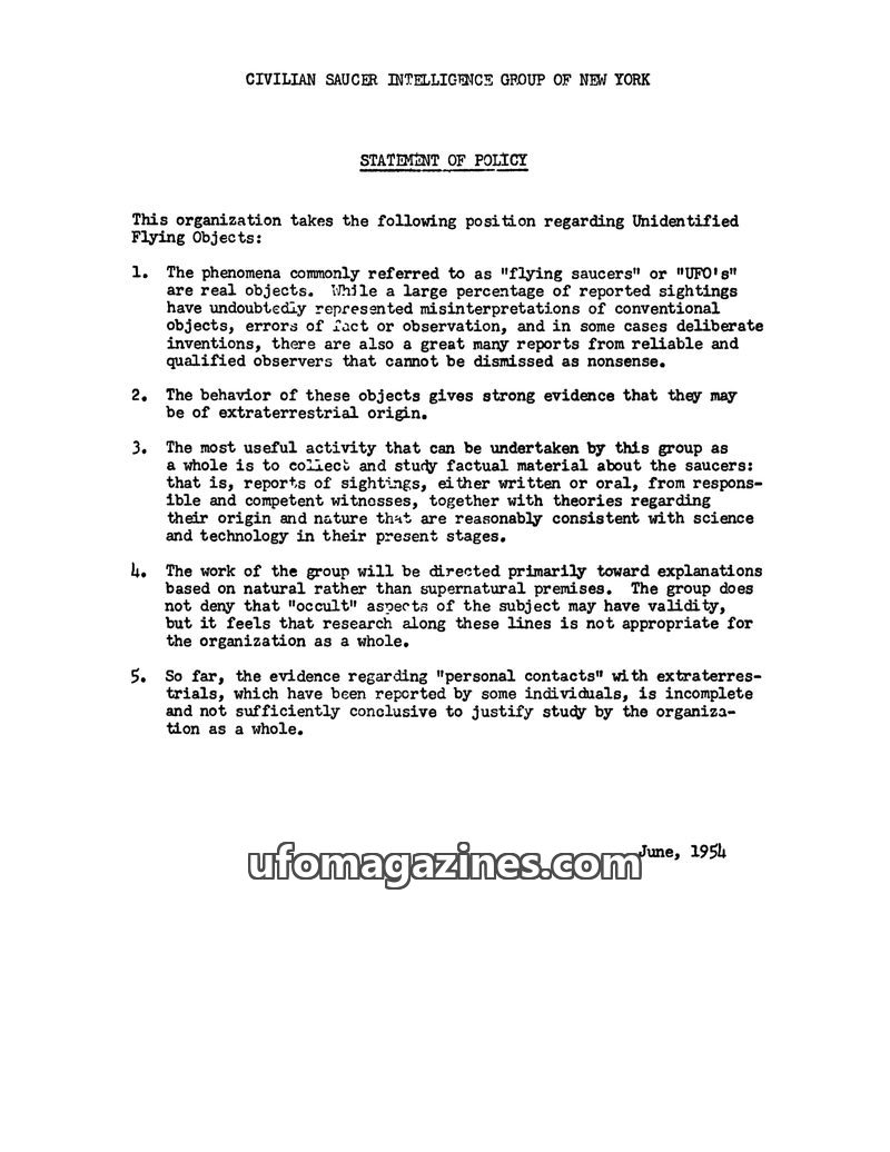 The Civilian Saucer Intelligence Group of New York (CSIG) has issued a Statement of Policy in June 1954, asserting that UFOs are real objects, likely of extraterrestrial origin. Th
