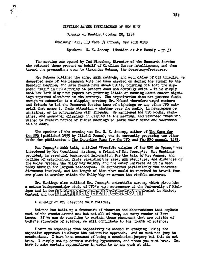 The meeting of Civilian Saucer Intelligence of New York on October 28, 1955, featured M. K. Jessup, author of 'The Case for the UFO,' who presented his hypotheses on UFO origins, s