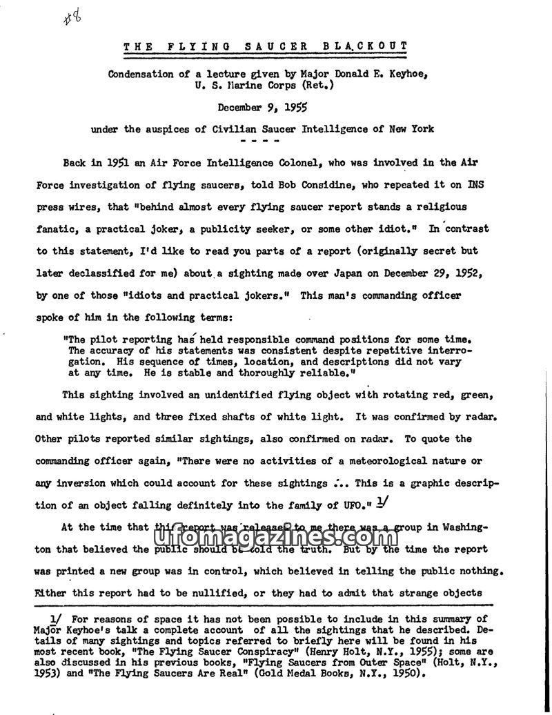 This document is a condensation of a lecture by Major Donald E. Keyhoe, delivered in December 1955, criticizing the US Air Force's handling of flying saucer reports. Keyhoe highlig