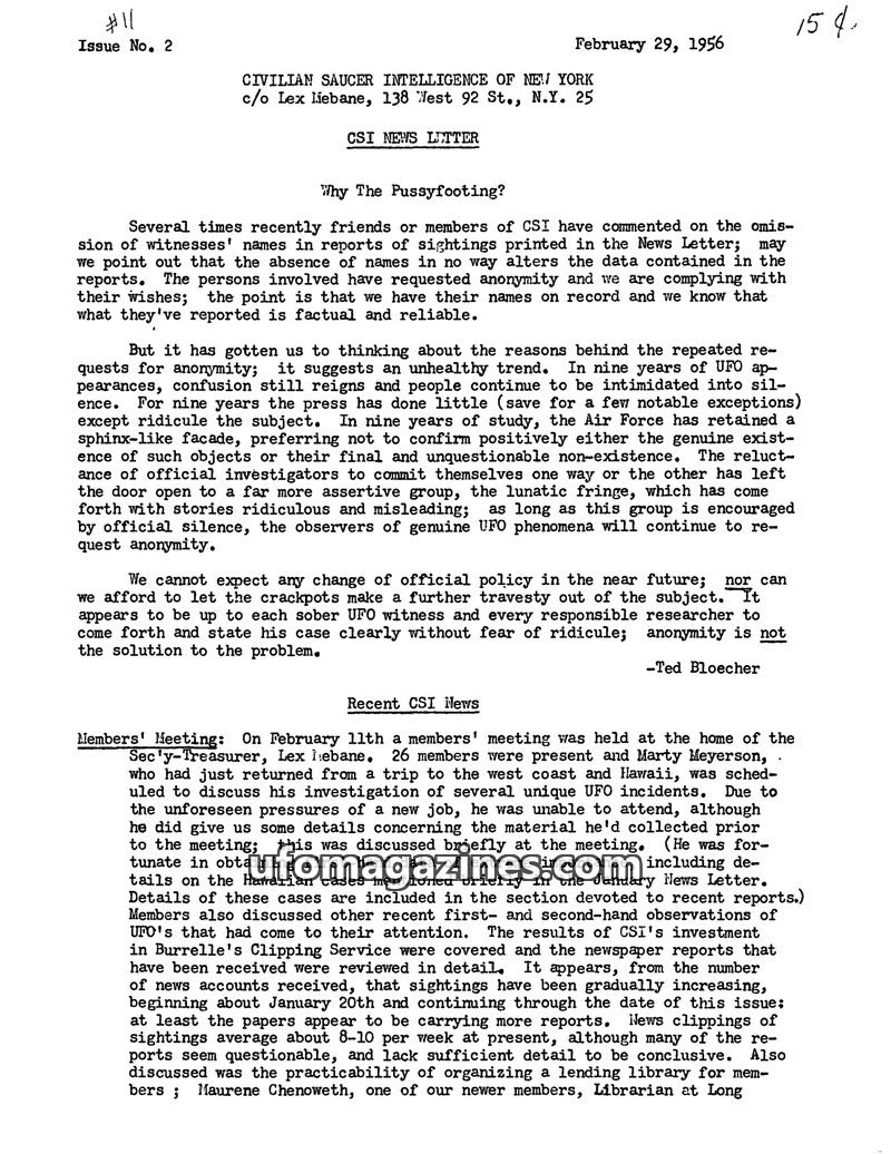 This issue of the CSI News Letter addresses the trend of witnesses requesting anonymity for their UFO reports, attributing it to public ridicule and official silence. It highlights