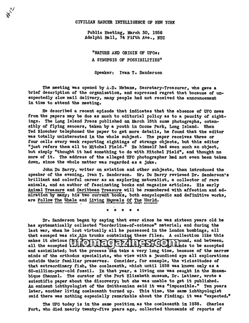 At a March 30, 1956 meeting of the Civilian Saucer Intelligence of New York, Ivan T. Sanderson discussed the nature and origin of UFOs. He drew parallels between the scientific acc