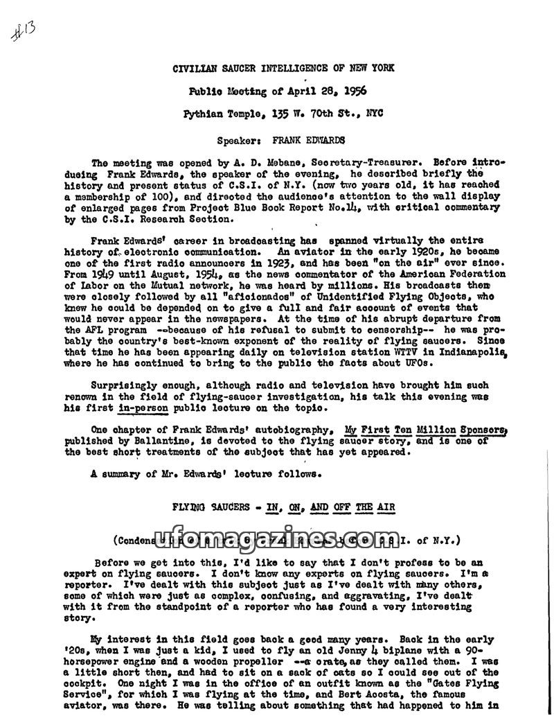 This document details a public meeting of the Civilian Saucer Intelligence of New York on April 28, 1956, featuring speaker Frank Edwards. Edwards, a veteran broadcaster, shares hi