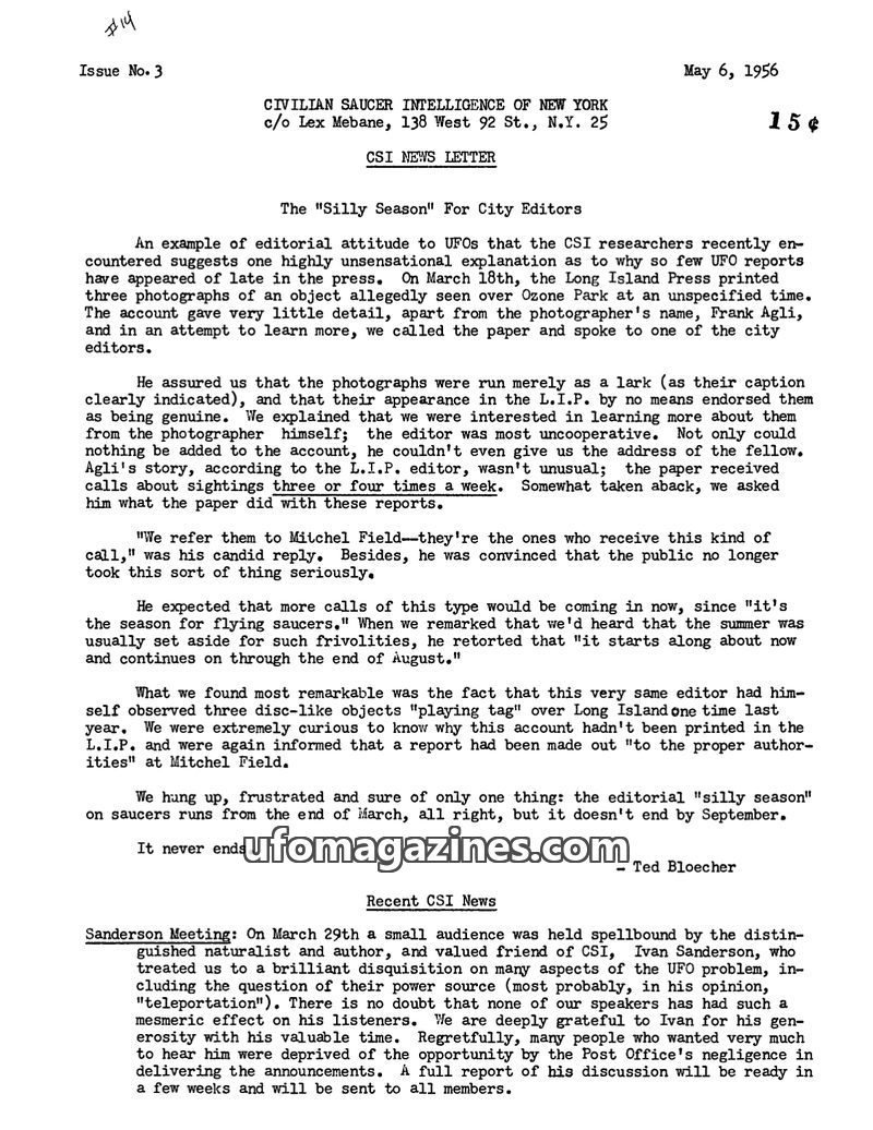 This issue of the CSI News Letter, dated May 6, 1956, addresses the perceived 'silly season' for UFO reporting in the press, suggesting city editors often treat such accounts dismi
