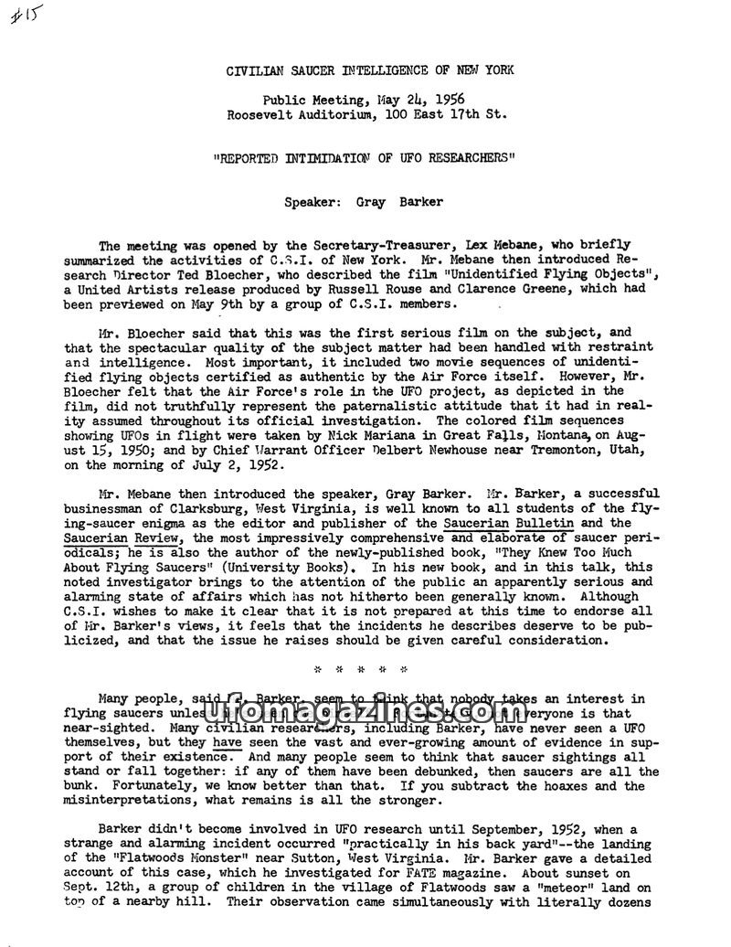 At a May 24, 1956, meeting of the Civilian Saucer Intelligence of New York, speaker Gray Barker presented his findings on the alleged intimidation of UFO researchers. He detailed t