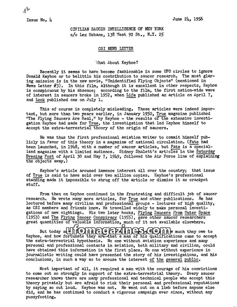 This issue of the CSI News Letter defends Donald Keyhoe's pioneering role in UFO research against recent belittling. It critiques the 'Dust-Mop' theory, which posits secret governm