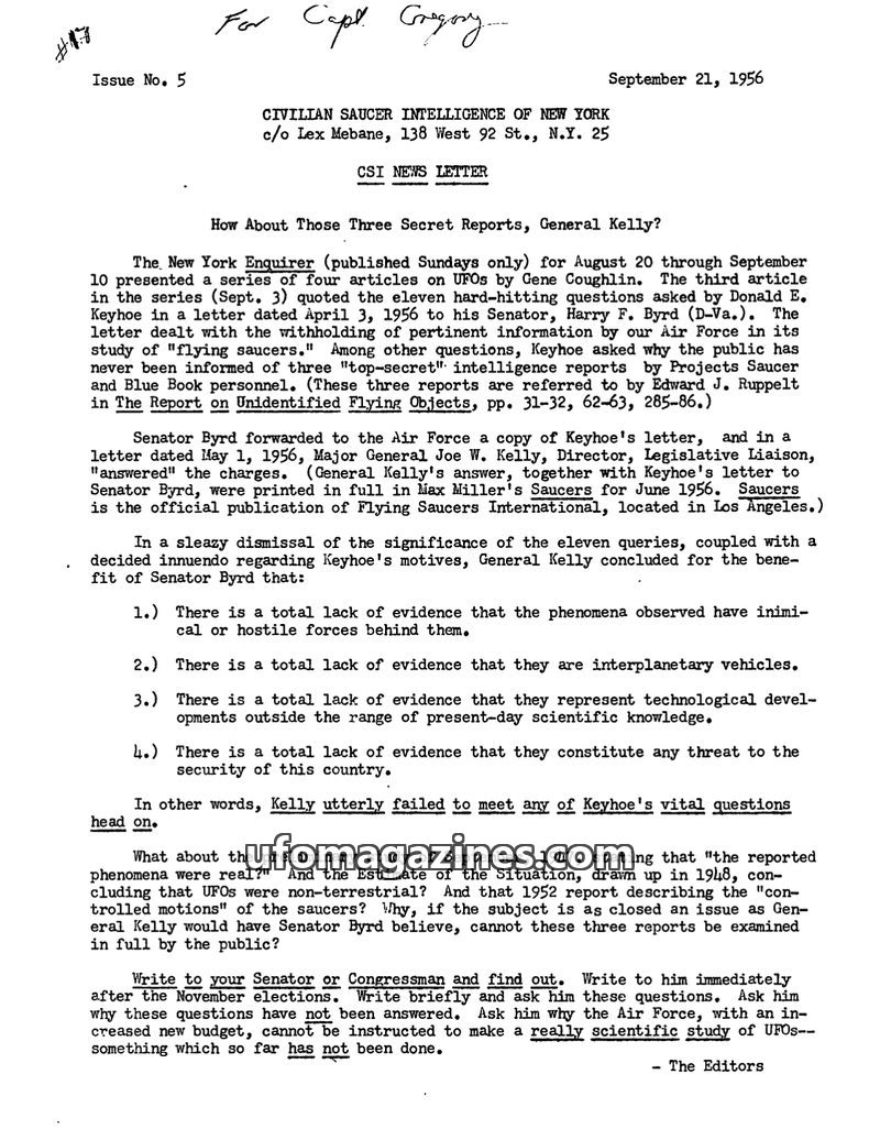 This issue of the CSI News Letter focuses on the controversy surrounding General Joe W. Kelly's response to Donald E. Keyhoe's questions about Air Force UFO investigations. The new