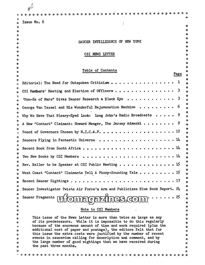 This issue of the CSI News Letter focuses on the need for critical evaluation of UFO claims, highlighting the 'Mon-Ka of Mars' hoax as a prime example of how fraudulent stories dam