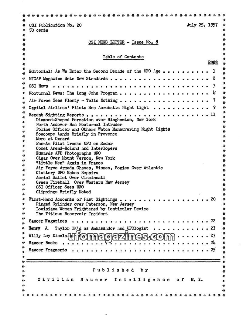 This issue of the CSI News Letter, dated July 25, 1957, marks the tenth anniversary of Kenneth Arnold's observation and discusses the state of ufology. It highlights NICAP's effort