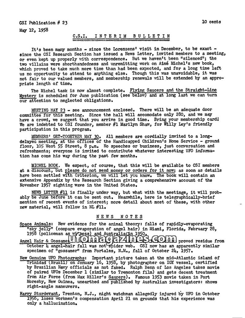 The CSI Interim Bulletin from May 12, 1958, addresses delays in publications due to work on Aimé Michel's book, 'Flying Saucers and the Straight-Line Mystery'. It announces upcomin
