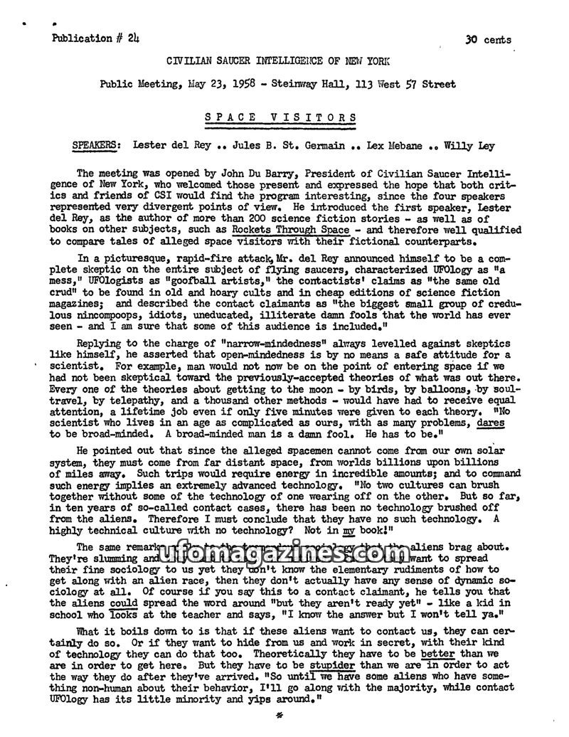 This issue documents a meeting of the Civilian Saucer Intelligence of New York on May 23, 1958, featuring four speakers with divergent views on 'space visitors.' Lester del Rey, a