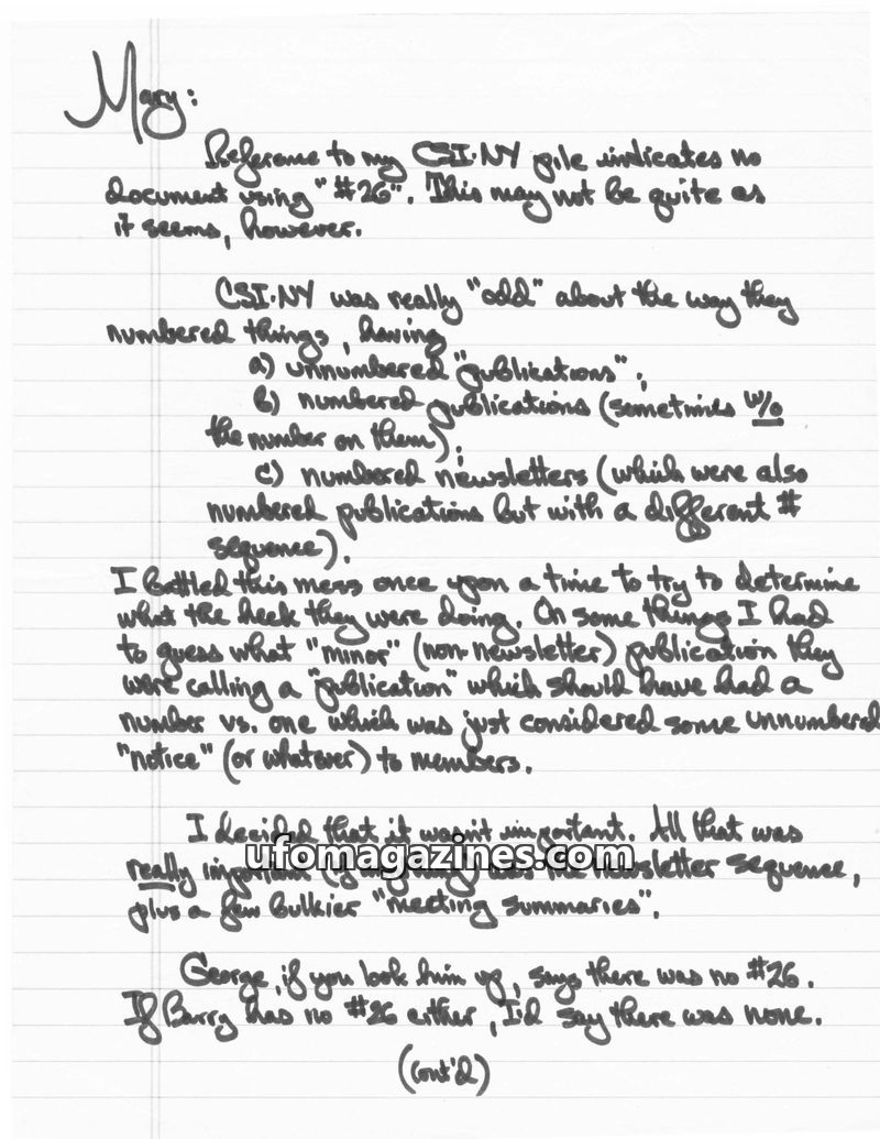This document is a handwritten note discussing the inconsistent publication numbering system of CSI-NY. The author, Mike, explains that CSI-NY had a chaotic approach, numbering pub