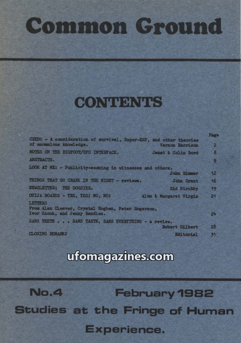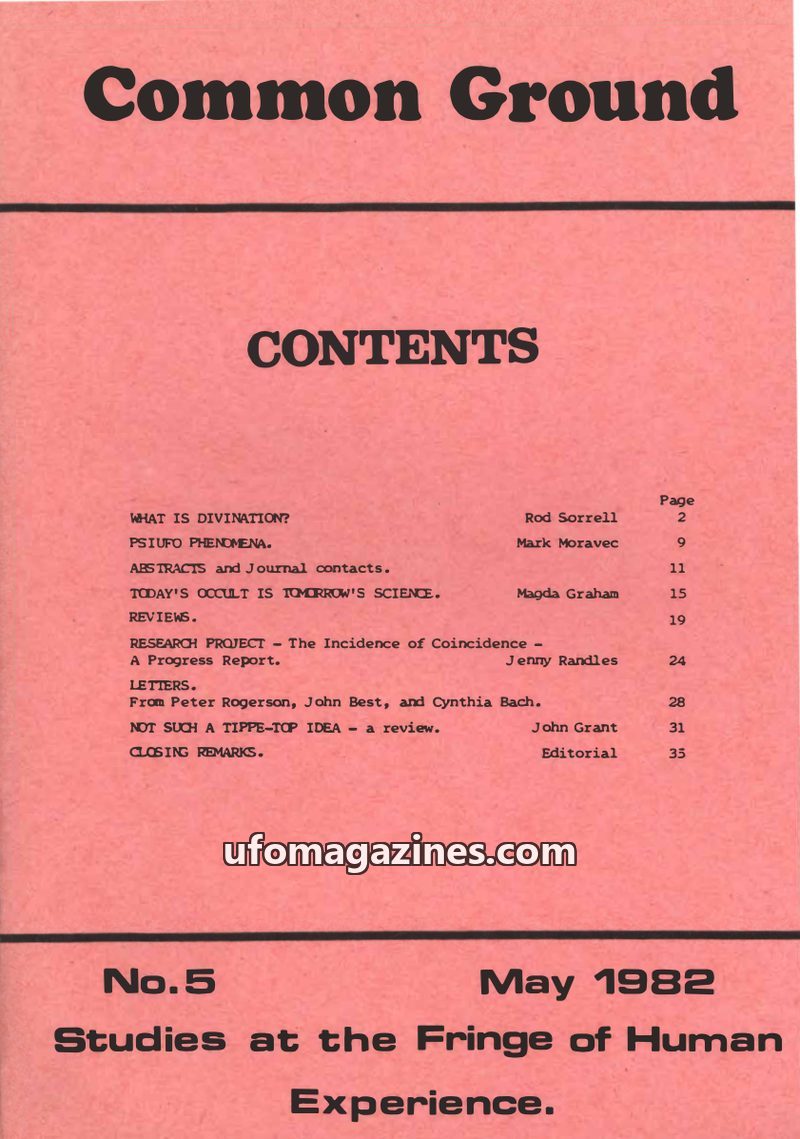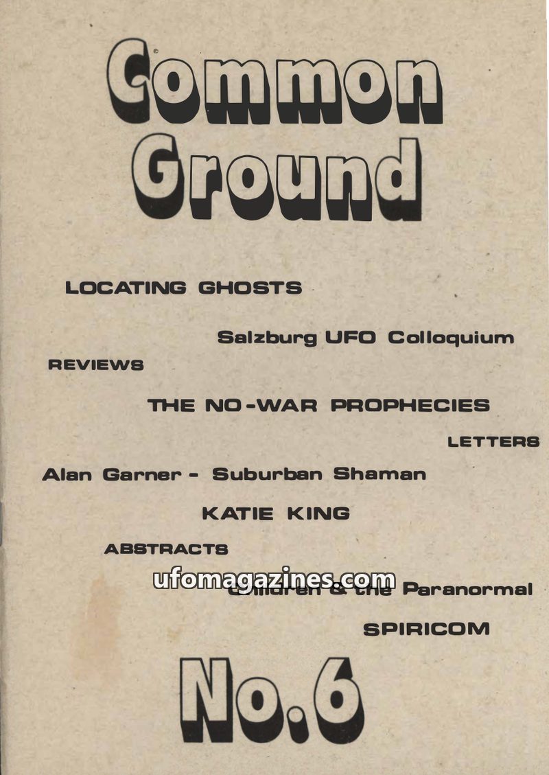 This issue of 'Common Ground' (No.6) covers a range of paranormal and ufological topics. It features notes from the 1982 Salzburg Colloquium, emphasizing psychological aspects of U