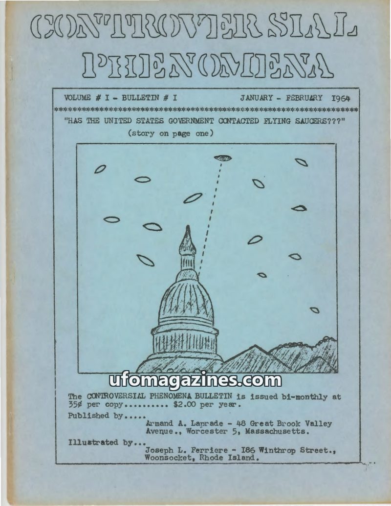 This inaugural issue of Controversial Phenomena Bulletin from January-February 1964 delves into several unexplained phenomena. It questions whether the U.S. Government has contacte