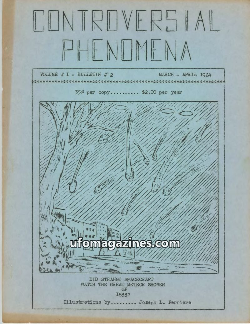 This issue of Controversial Phenomena from March-April 1964 delves into unexplained events, including the possibility of spacecraft observing the 1833 meteor shower. It also discus