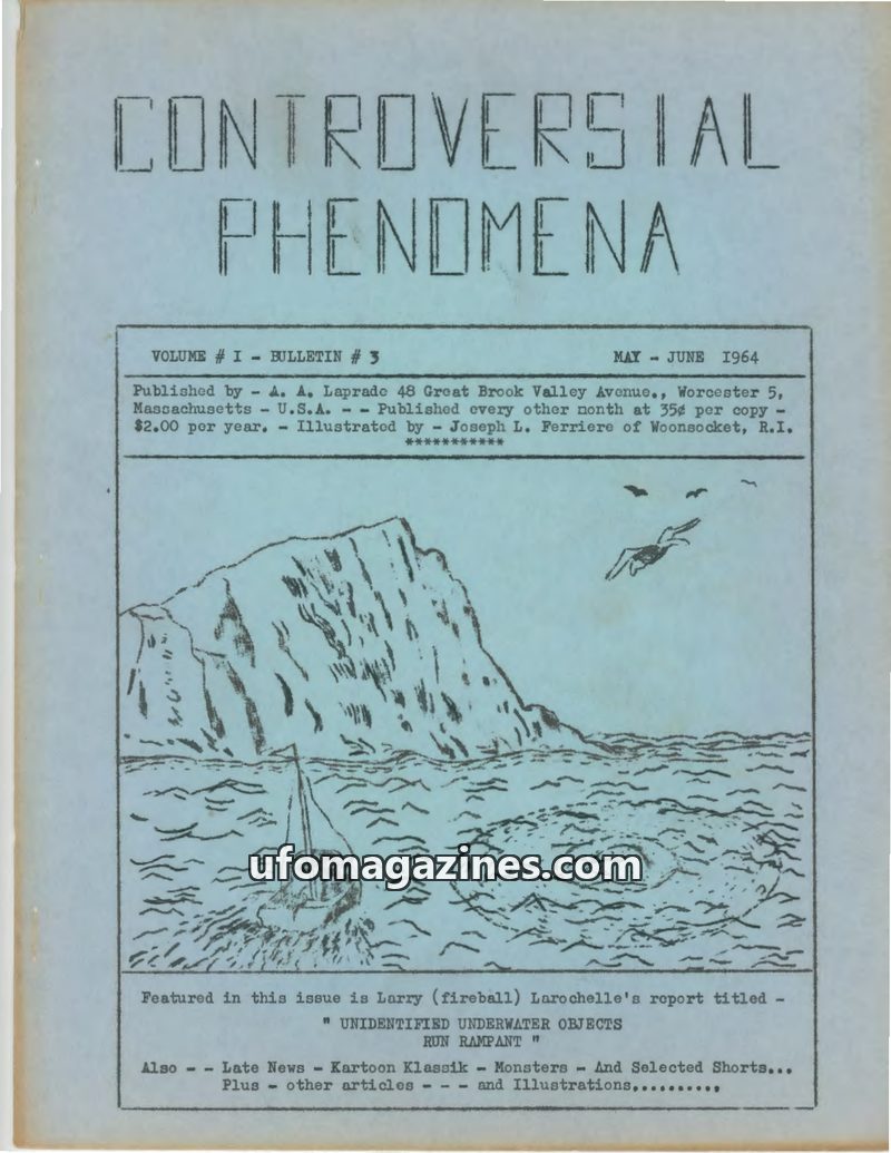 This issue of Controversial Phenomena from May-June 1964 features a report on unidentified underwater objects, including incidents of vessels being damaged or sinking after encount
