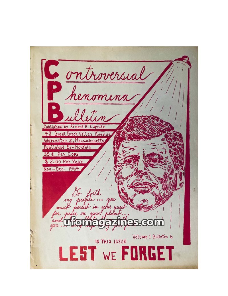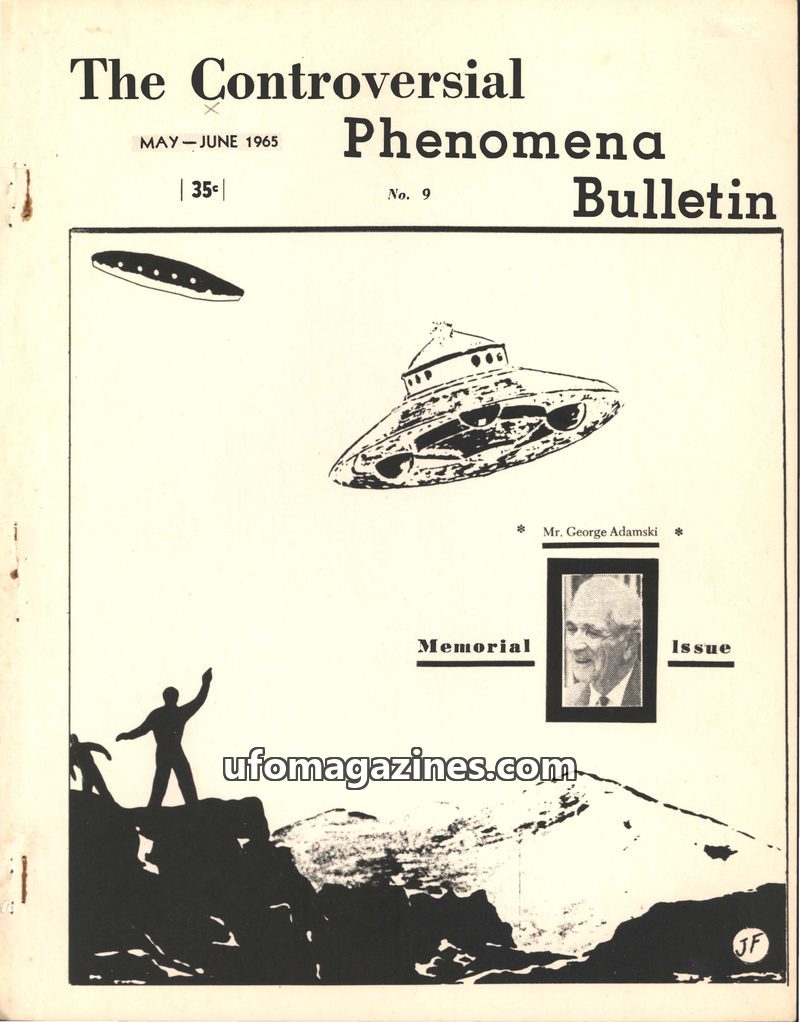 This issue of The Controversial Phenomena Bulletin is a memorial to George Adamski, who passed away in April 1965. It highlights his claims of contact with Venusians and other spac