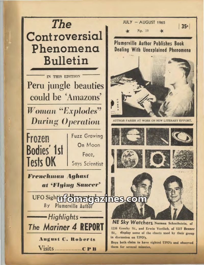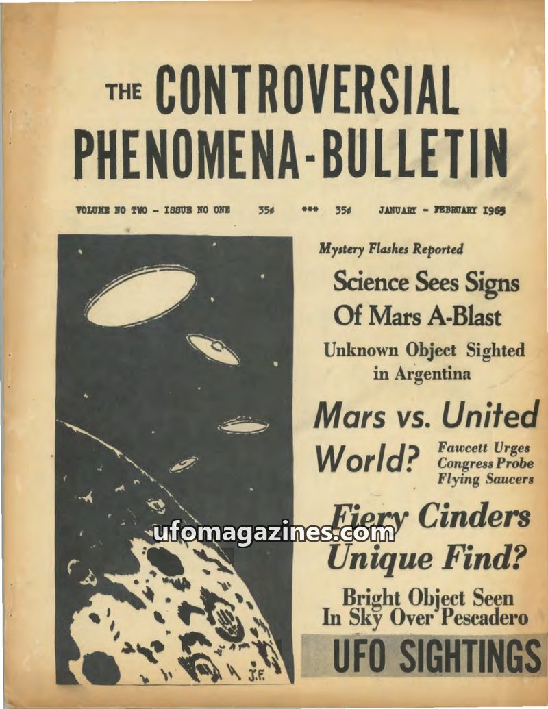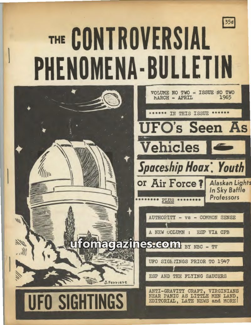 This issue of The Controversial Phenomena Bulletin covers a range of UFO reports and related topics from the 1920s to early 1965. It includes historical sightings prior to 1947, su