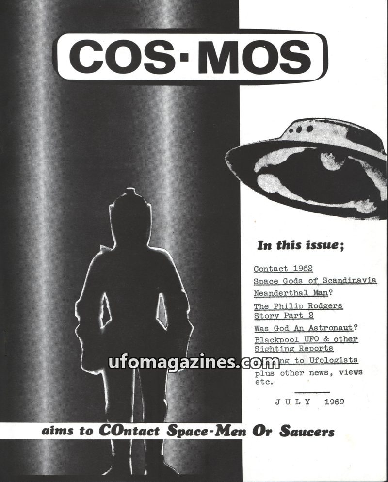 This issue of COS-MOS, dated July 1969, focuses on UFO sightings, the space race, and ancient astronaut theories. It includes a detailed account of a purported encounter in Vienna