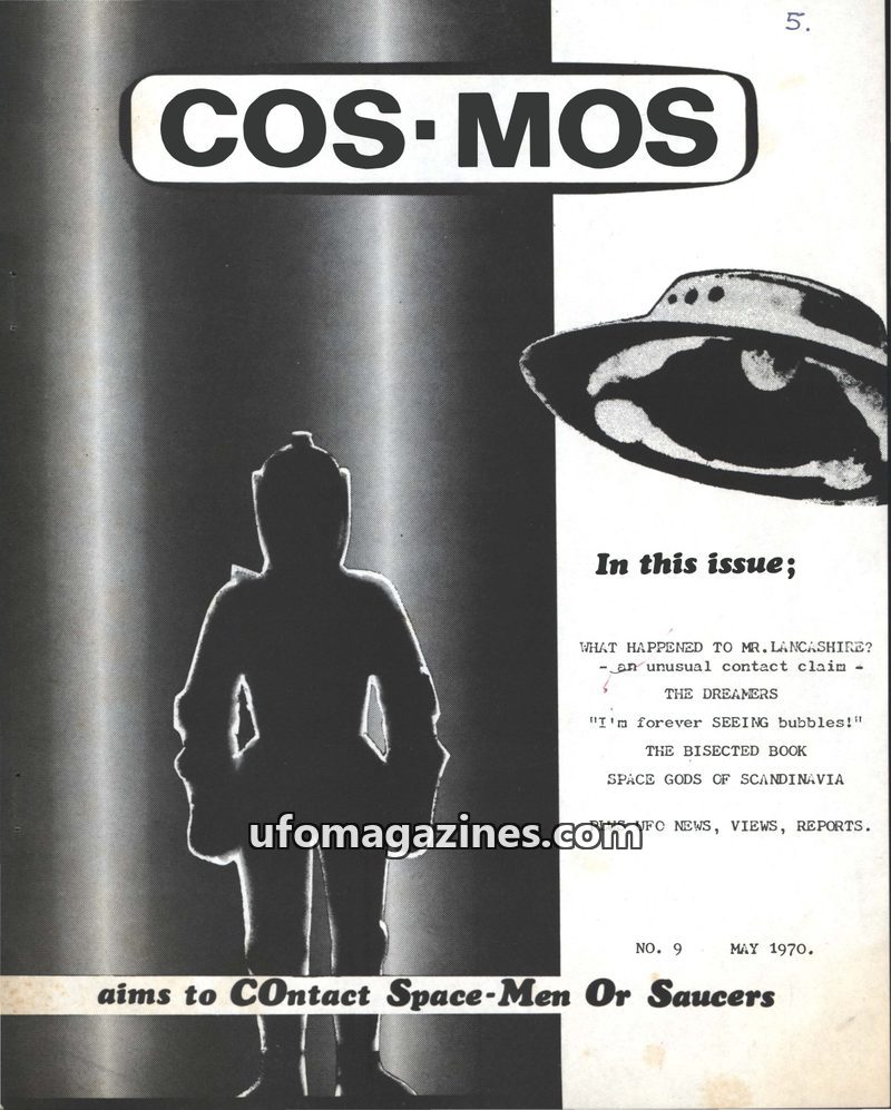 This issue of COS-MOS, dated May 1970, delves into unusual UFO contact claims, notably the detailed account of Albert Lancashire's 1942 encounter and subsequent psychic experiences