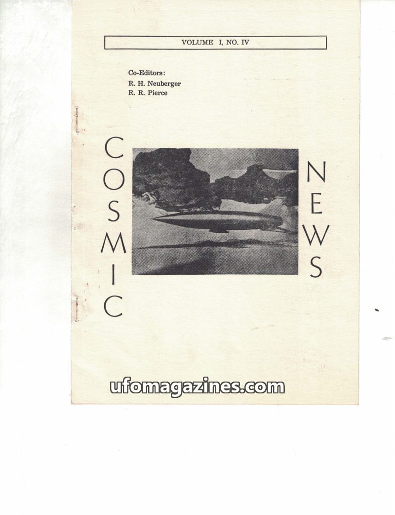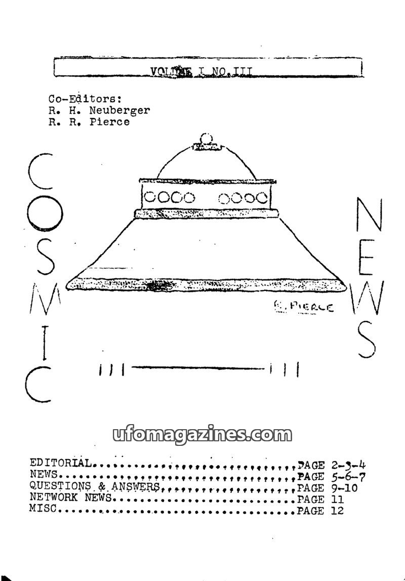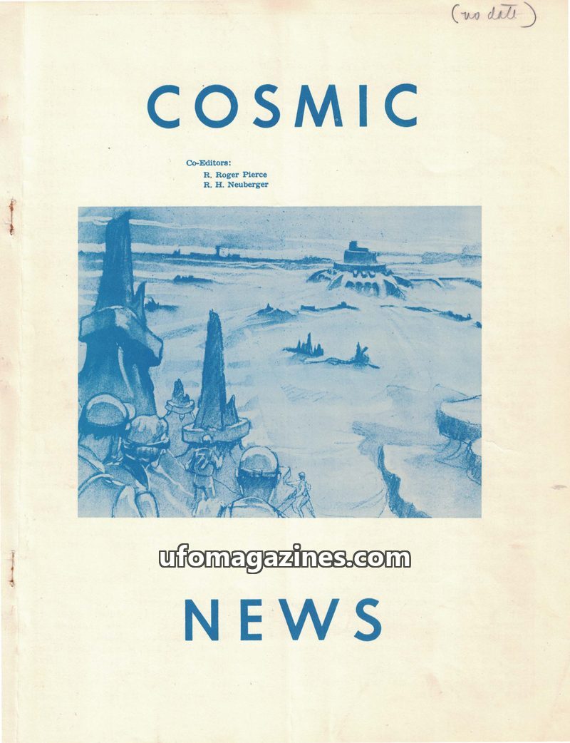AI-generated English summaries and cover images of Cosmic News (Pierce and Neuberger) from the Archives for the Unexplained (AFU) in Norrköping, Sweden. Each entry summarises the complete contents of an issue — articles, sighting reports, interviews, key people, locations, and dates.