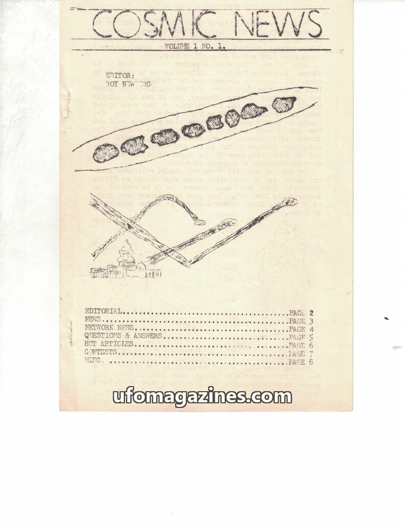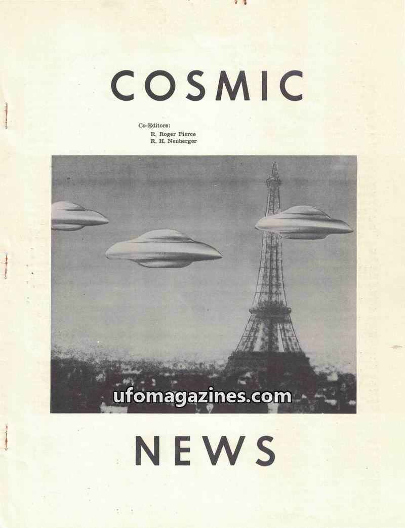 This issue of Cosmic News from the 1950s delves into UFO phenomena, featuring reports of sightings over Washington D.C. in 1952, including radar contacts and visual observations. I